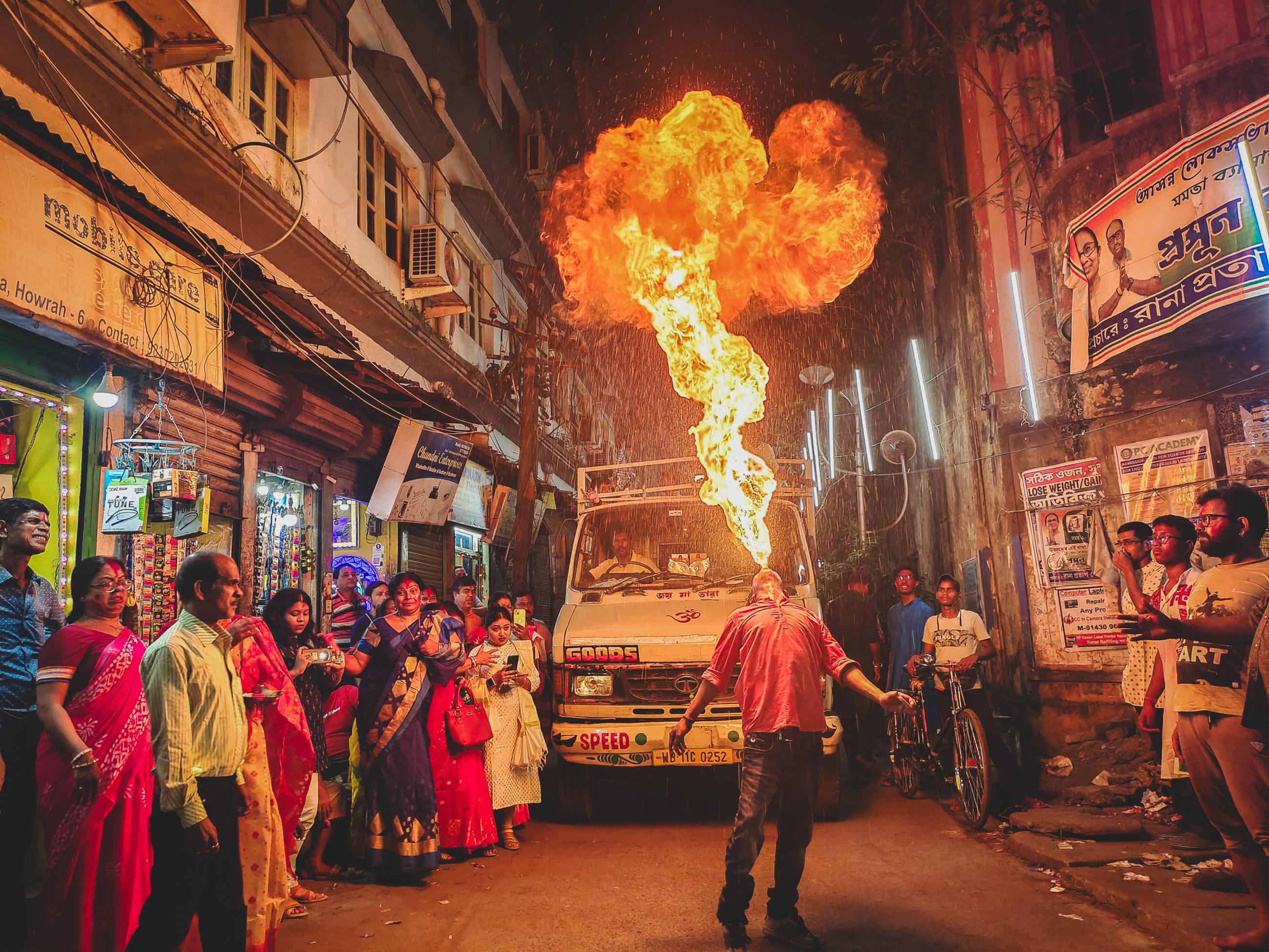 This image was shot during the Vijaya Dasami, the final day of Durga Puja, a festival celebrated commonly in Bengali culture, and across the world. Here, a man spits kerosene into thin air, makes a flame out of it using a matchstick.