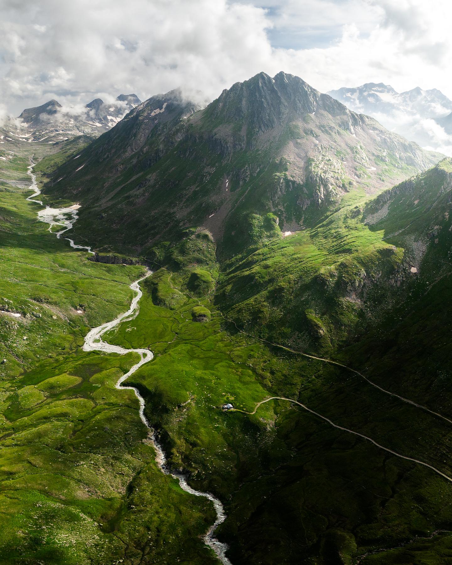 The image portrays the majestic Schwarzberg mountain near the Maighels river, a tributary of the Rhine. It was taken in August during a three day hiking trip with the photographer’s friends. Botta was extremely tired, but says the view ‘was just too good to not fly the drone.’ The light pierced through the clouds illuminating the scene in a dreamy way, so Botta took a three picture panorama of the scene. The little house creates a dramatic sense of scale.
