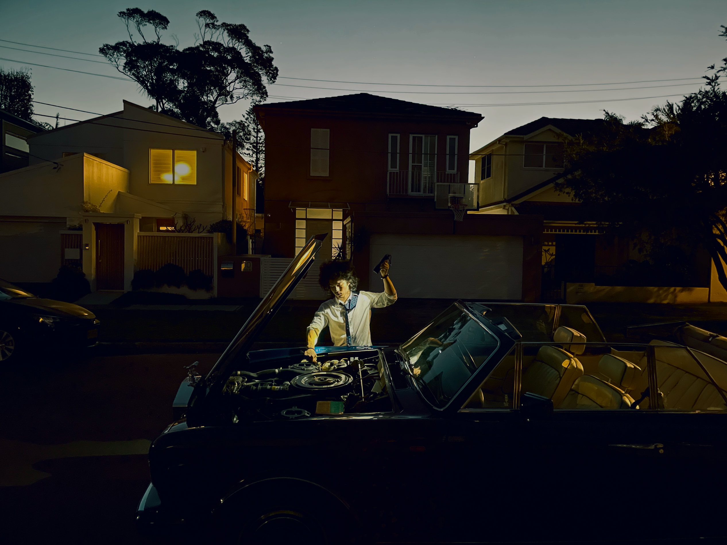 DJ Broken Down shows a person fixing a broken down car which looks like a DJ turntable. Hasanoff took the image in May 2024, inspired by artist Gregory Crewdson to use light to evoke a story.
