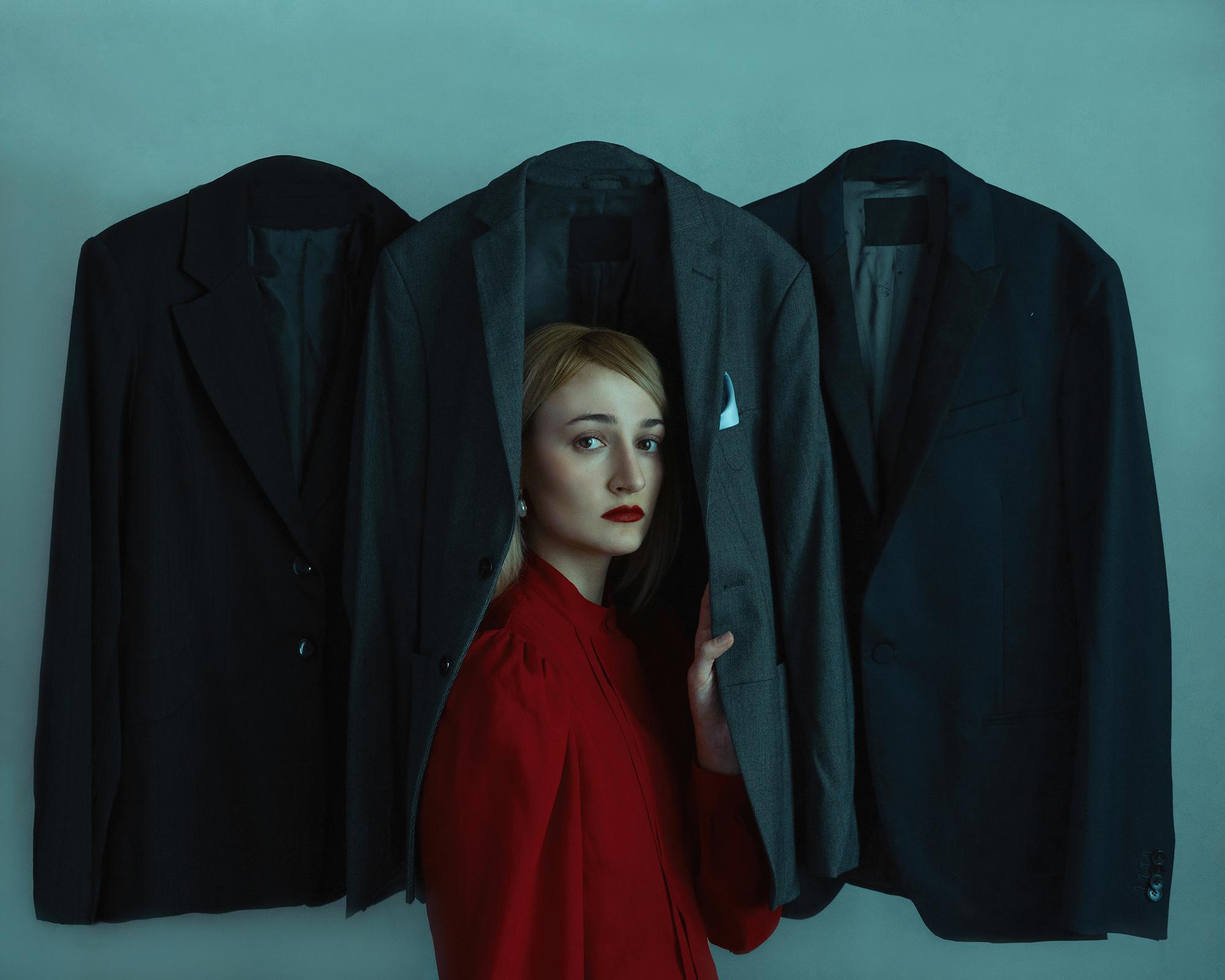 This self-portrait is a powerful metaphor for domestic violence. The solitary female figure in red stands amidst a trio of dark, empty suits that represent the invisible, oppressive presence of an abuser. The image evokes a sense of isolation and the courage to face one’s oppressors, reflecting the silent endurance that many victims of domestic violence carry within them.