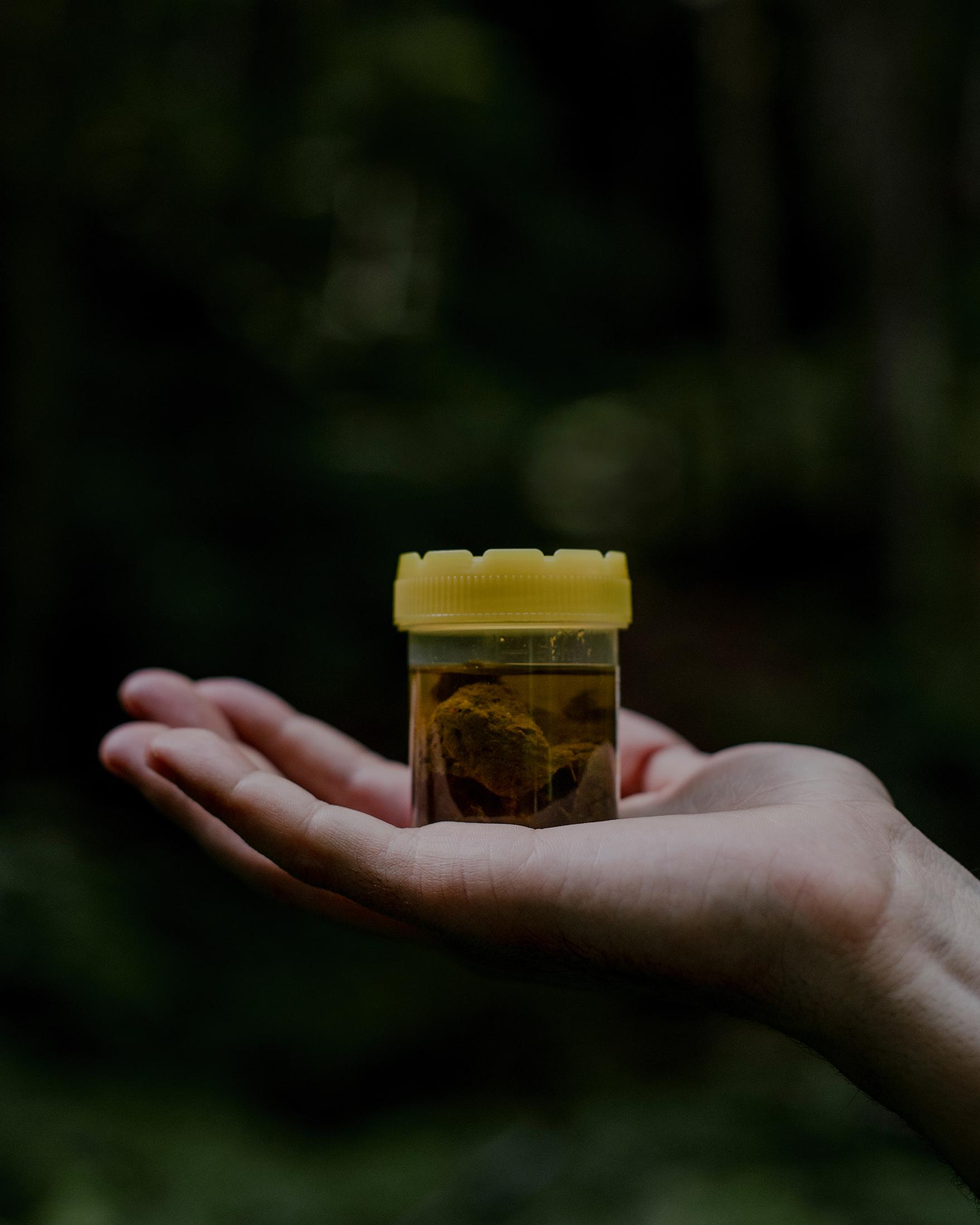 Today, there are around 200 European Bison living in the mountains of southwest Romania, among virgin forests and natural grasslands. They are the result of reintroductions to the region over the last 12 years. Here, a DNA sample from a bison’s excrement and fur is collected in an ethanol-filled flask. Collected during forest patrols by WWF rangers, the samples are transported to a lab in Germany, where they are tested to see the genetics of bison and the structure of the herd, as well as for parasitological and diet studies. Armenis, Romania.