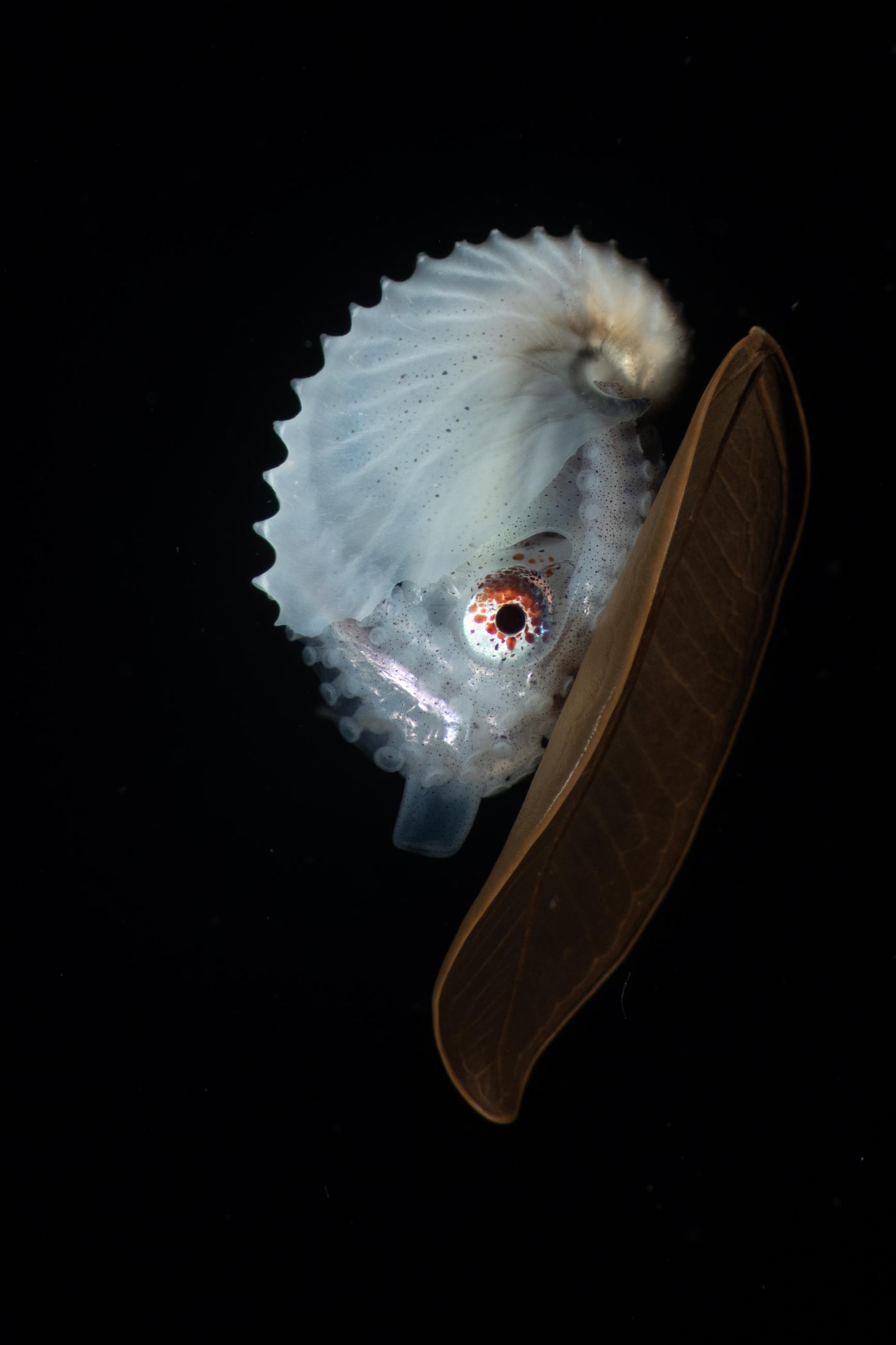 A Paper Nautilus 'surfs' on a leaf in the middle of the night in Anilao, Philippines.This image was shot during a night dive with underwater housing, strobes, and scuba gear, at 15m depth. Netcharussaeng shot this image to show the challenges of deep-sea life, along with the unique and beautiful ways in which animals adapt.