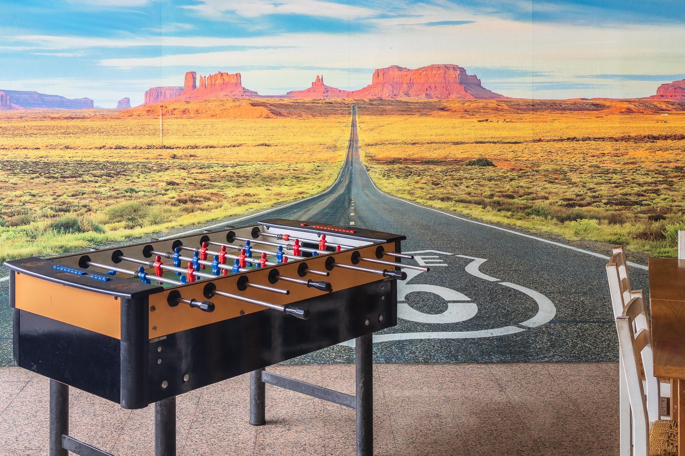 This photograph was taken in a bar in Vescovato, in the northern Italian countryside. The red and blue of the ‘fubalino’ (table football) is in the foreground, with dreams on the horizon.